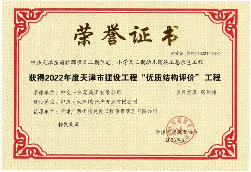 “優(yōu)質(zhì)結(jié)構(gòu)評價”工程是天津市建設(shè)工程結(jié)構(gòu)質(zhì)量的最高榮譽(yù)獎,獲此獎項(xiàng)表明東麗雅郡項(xiàng)目二期在工程質(zhì)量、安全生產(chǎn)、現(xiàn)場文明施工和施工管理等方面均達(dá)到先進(jìn)水平。