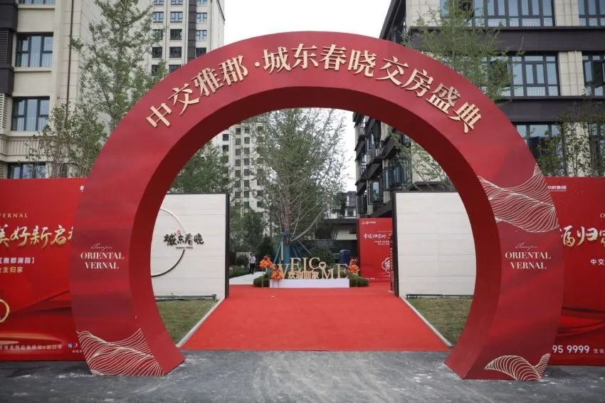 交房現場干凈整潔,紅色的拱門盡顯交付的喜悅,一物一景都以恭迎的姿態,迎接業主歸家。
